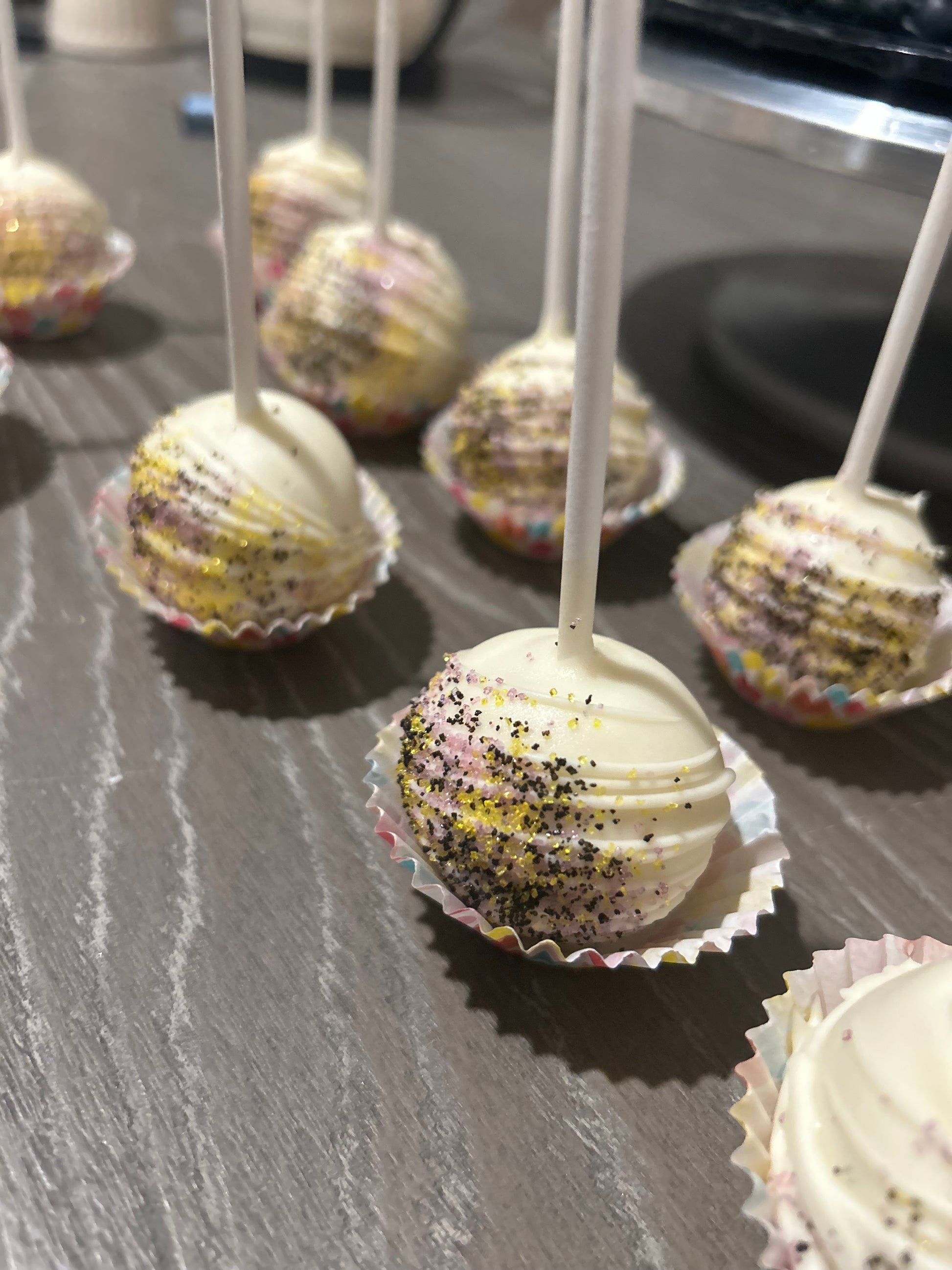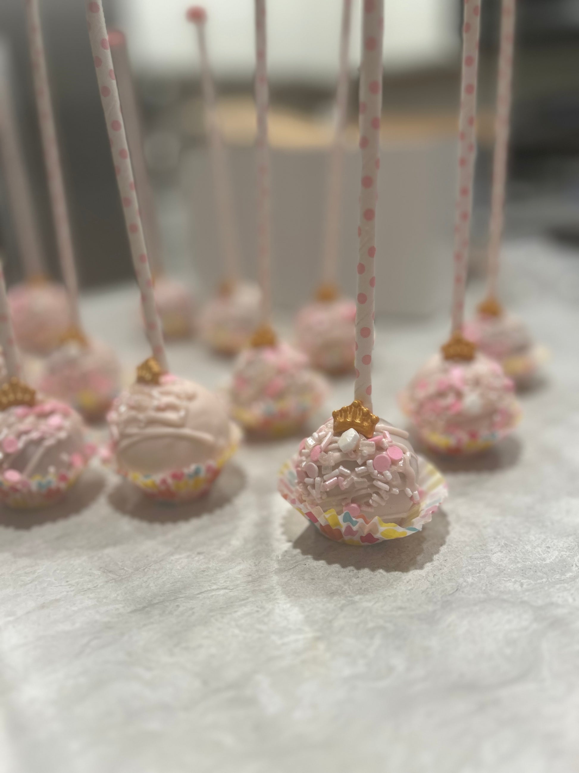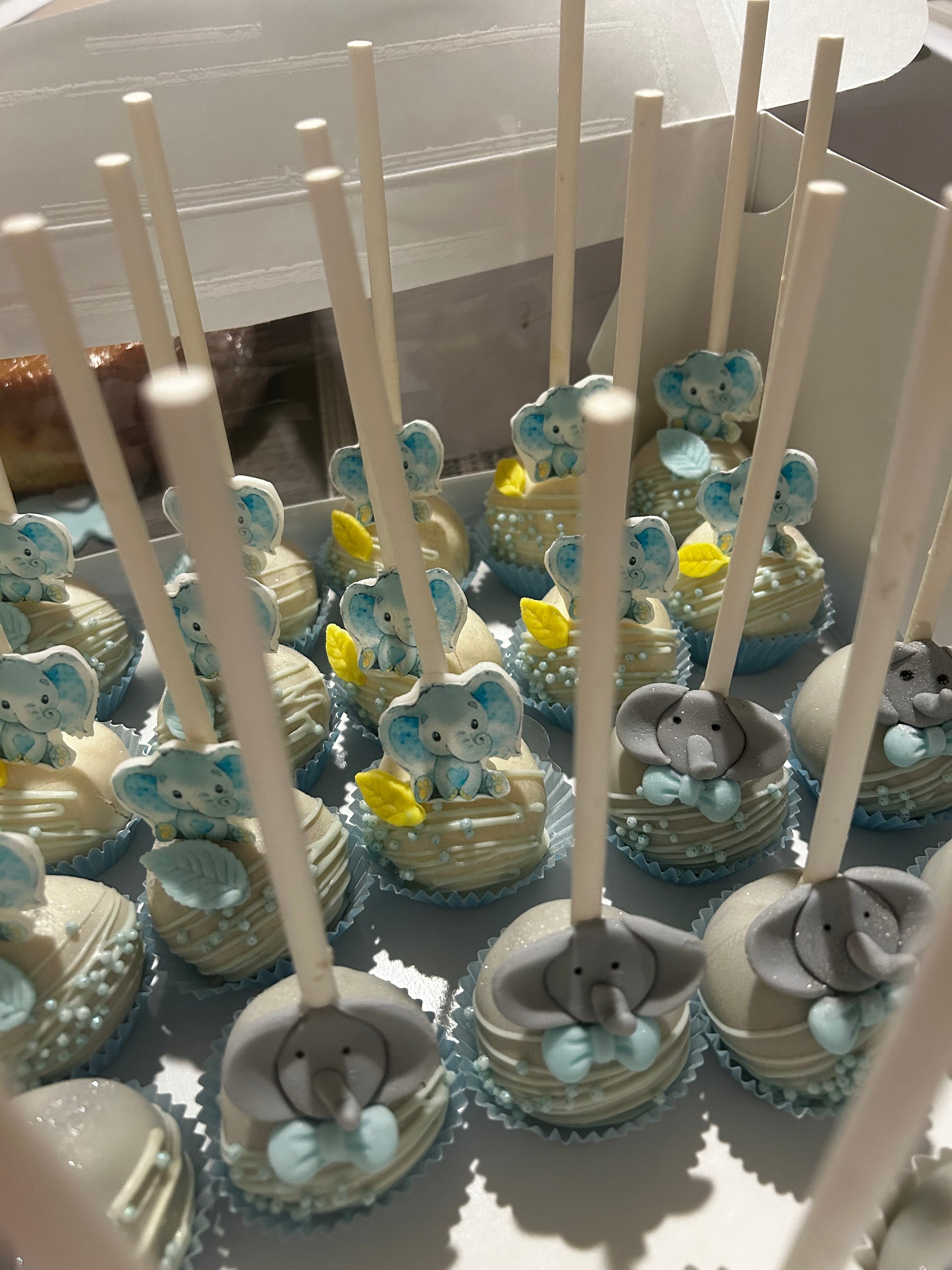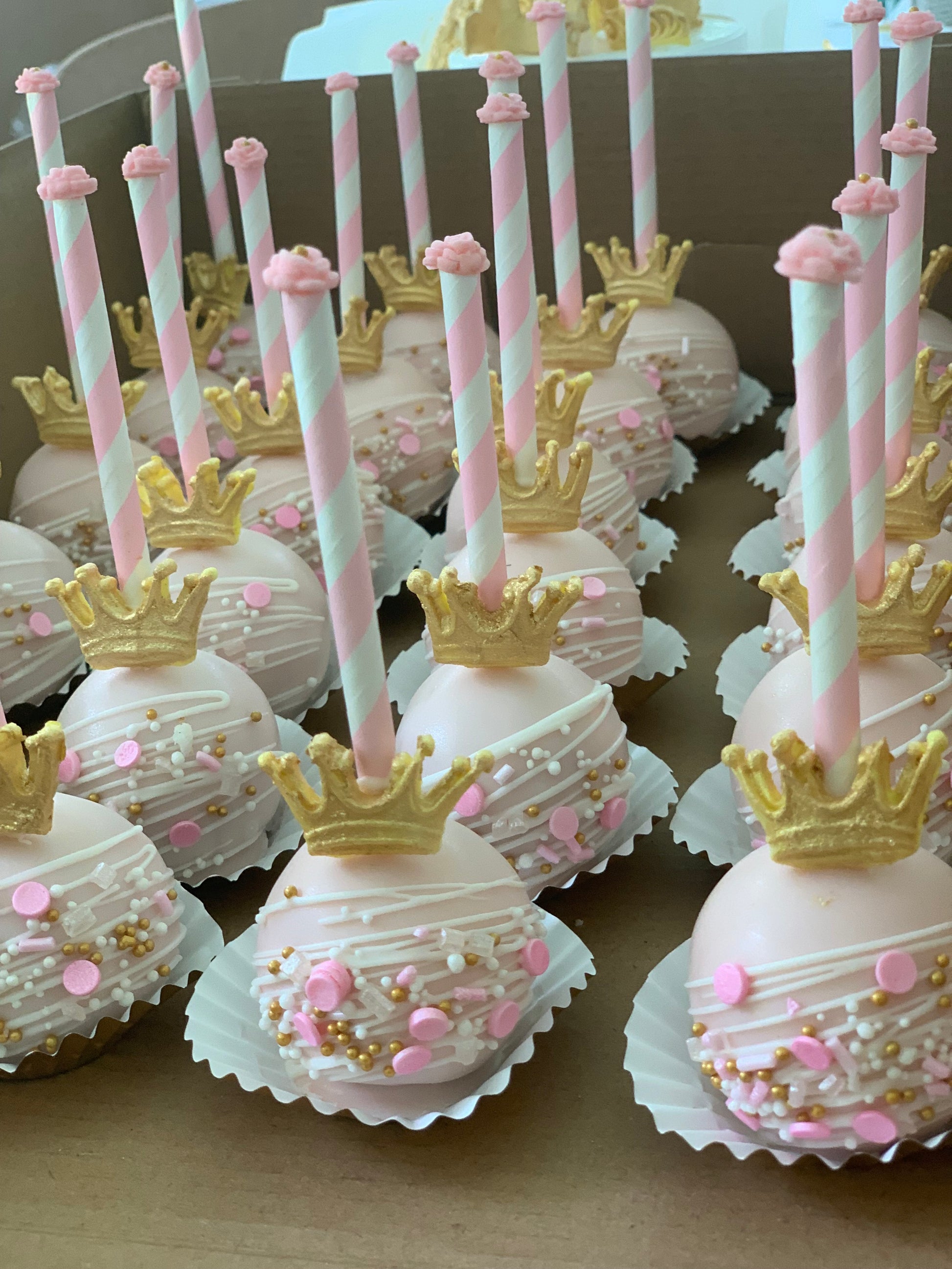 Bolitas sabor vainilla rellenas de dulce de leche de vainilla cubiertas con ganache de chocolate.