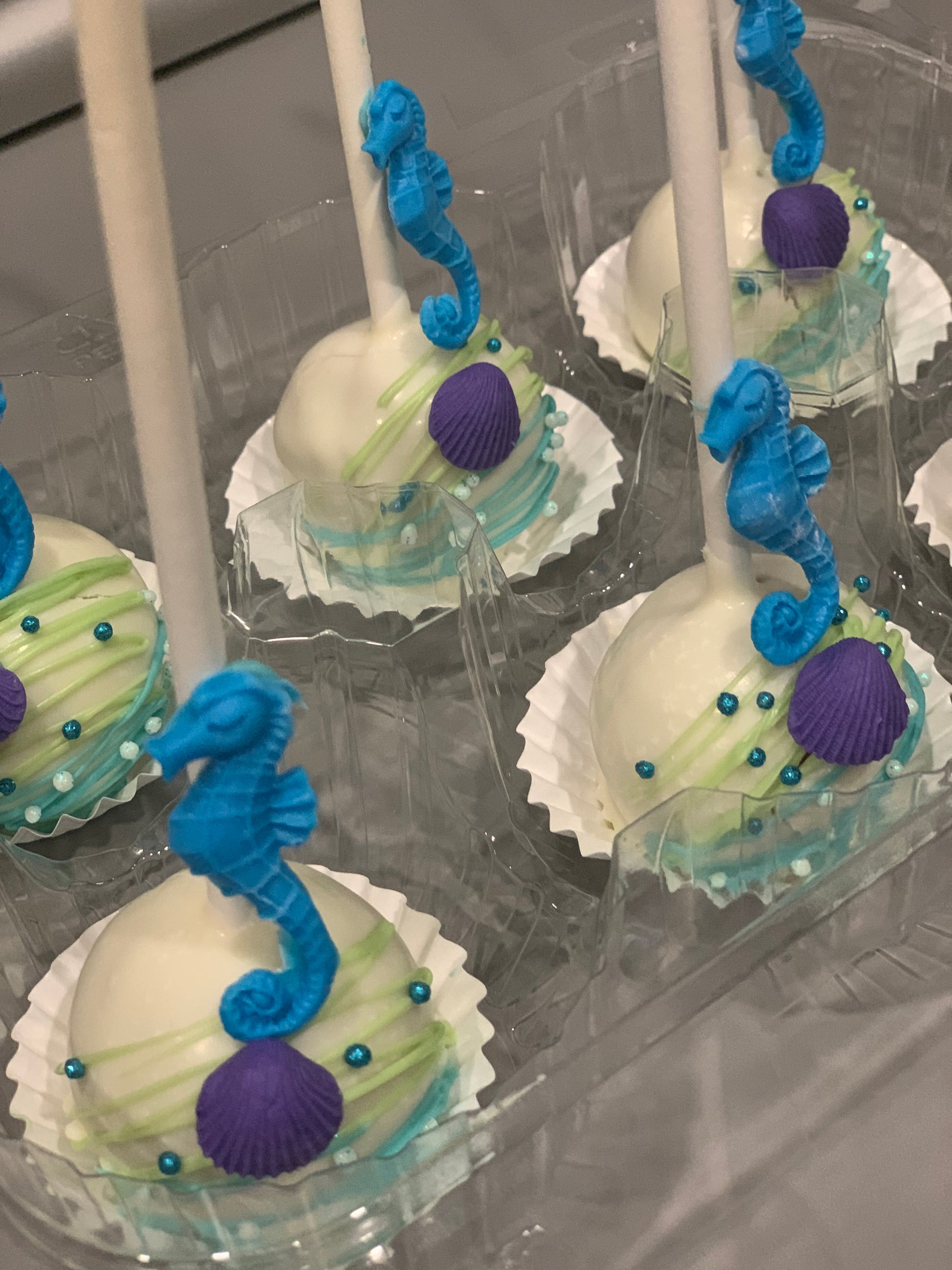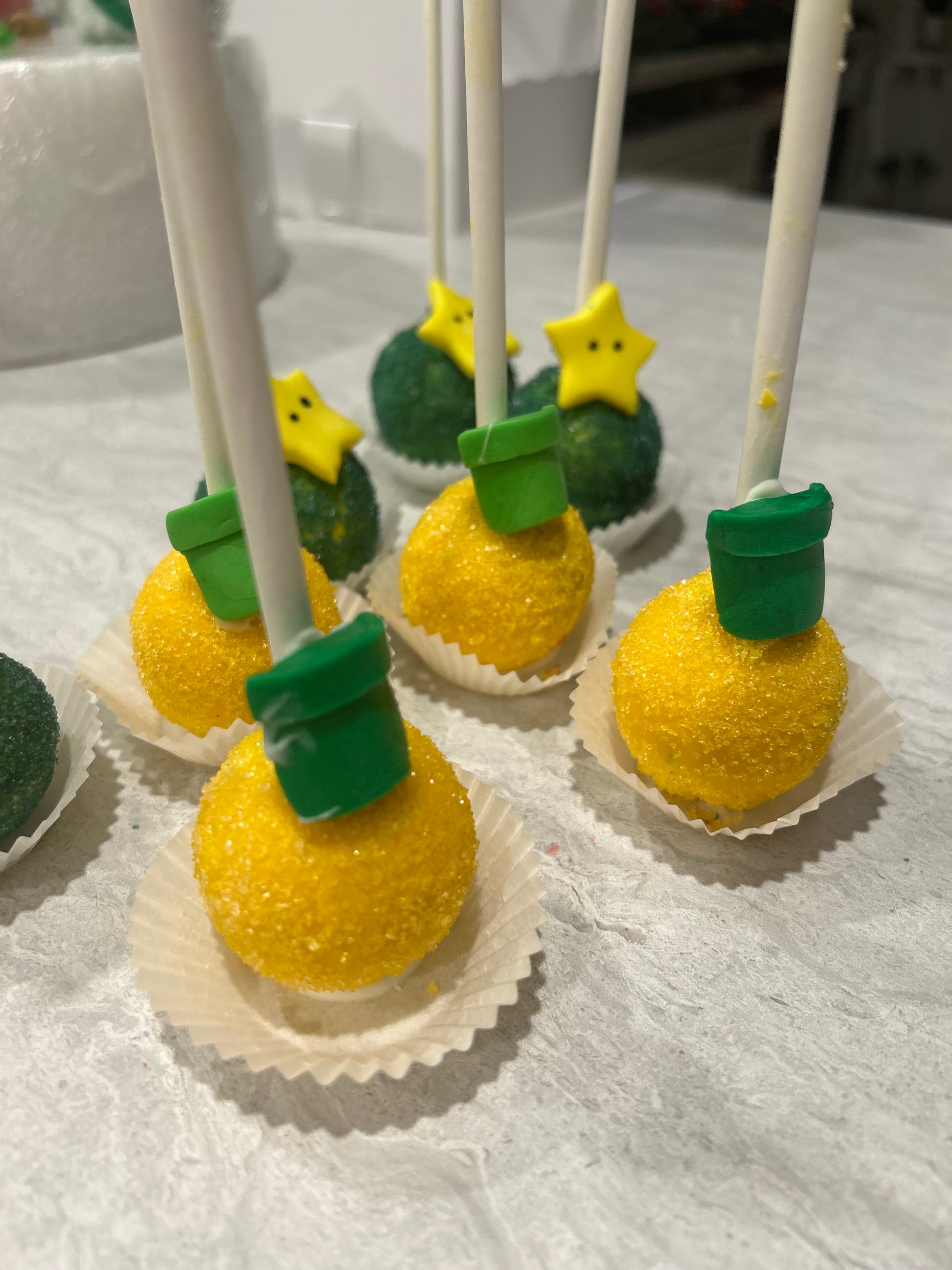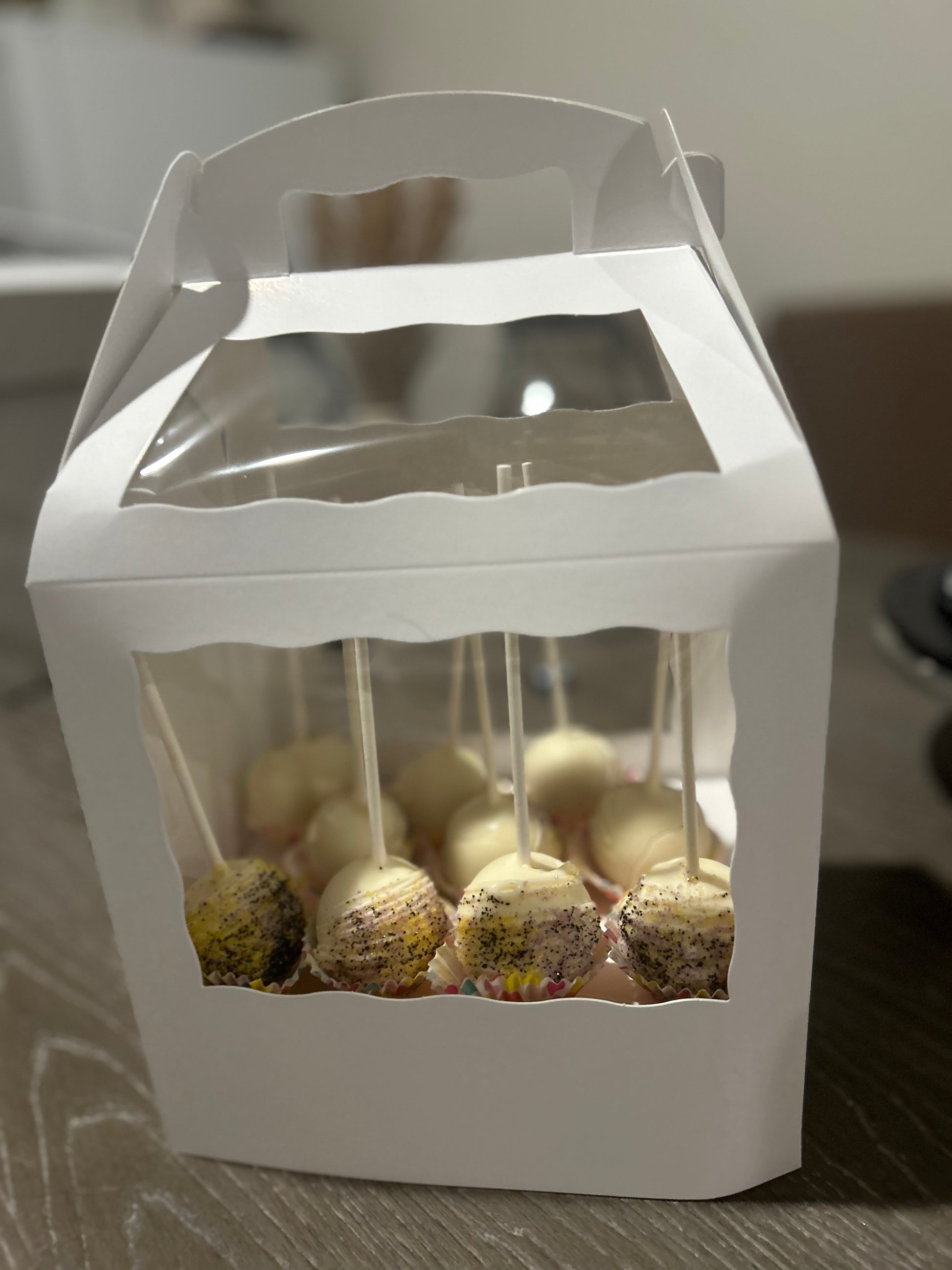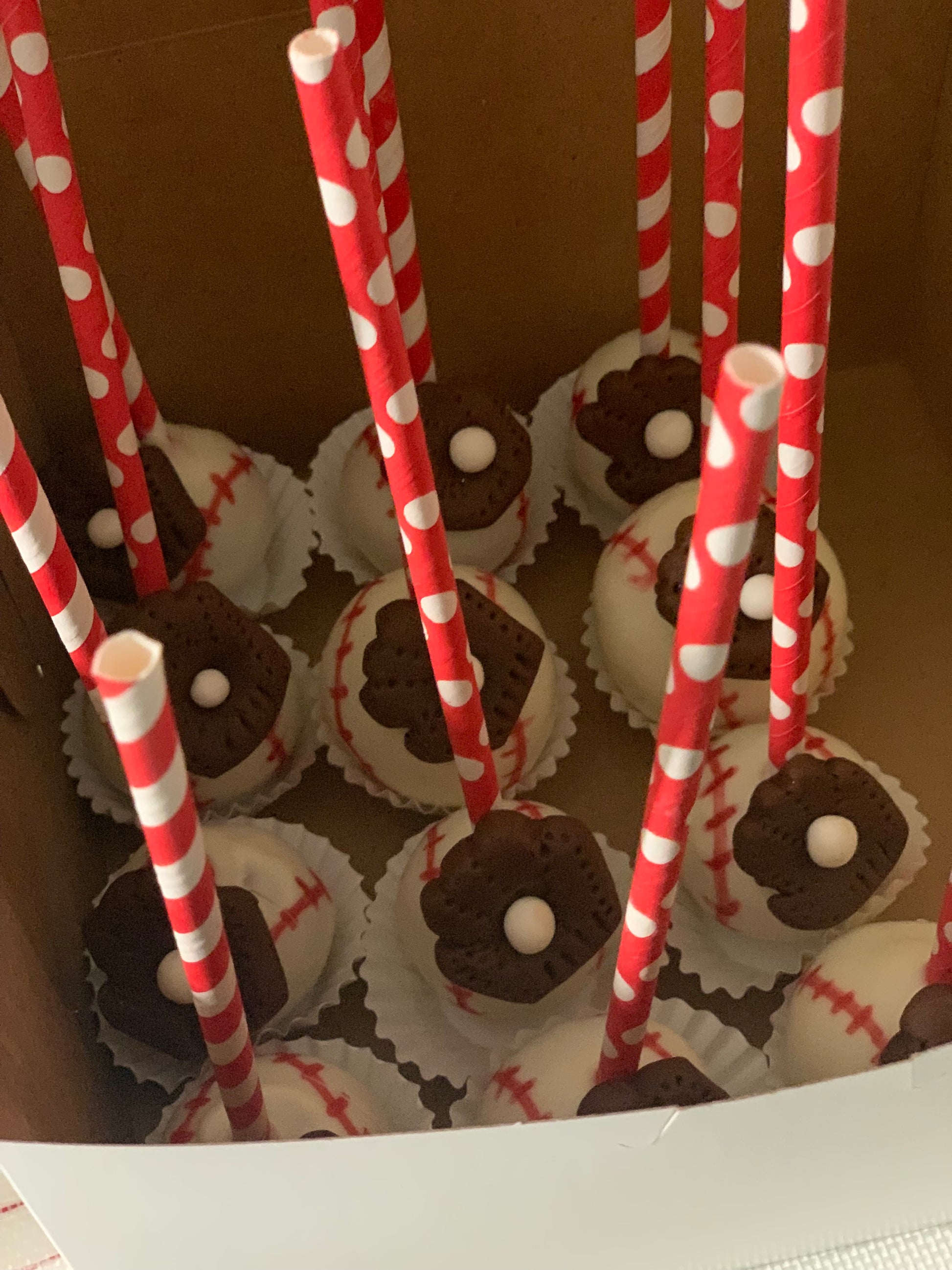 Bolitas sabor vainilla rellenas de dulce de leche de vainilla cubiertas con ganache de chocolate.